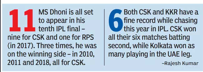 Another crucial issue is the outcome of the toss. Dubai, right through this phase of the IPL, has proved a chasing ground because the dew tends to set in as the evening progresses, making it difficult for the bowlers to hold the ball. The toss becomes all the more important then, because KKR banks heavily on wrist spinners Narine and Varun Chakravarthy.
