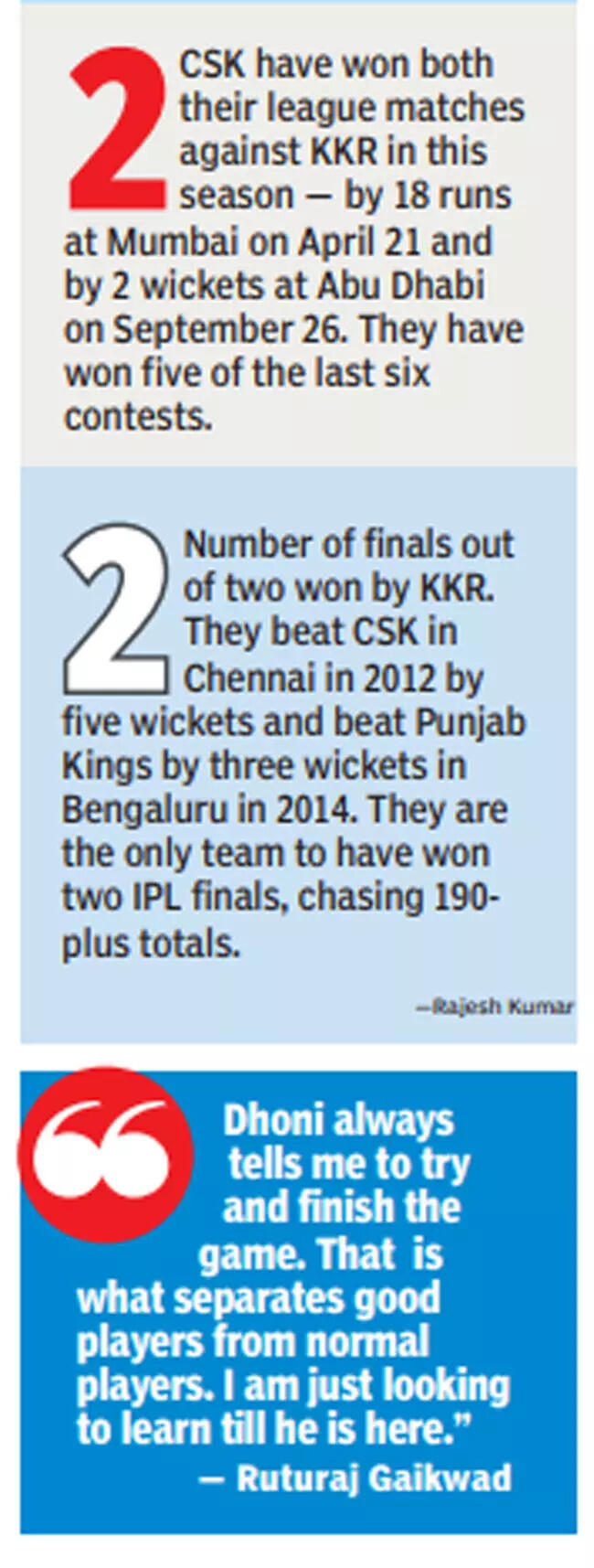 While CSK’s only spinner is Ravindra Jadeja and Dhoni has enough bowling back-up, KKR’s trump cards are too wellknown. Varun and Narine, along with Shakib (if he plays), have to be on top of their game if they have to entertain any hopes of stopping CSK.