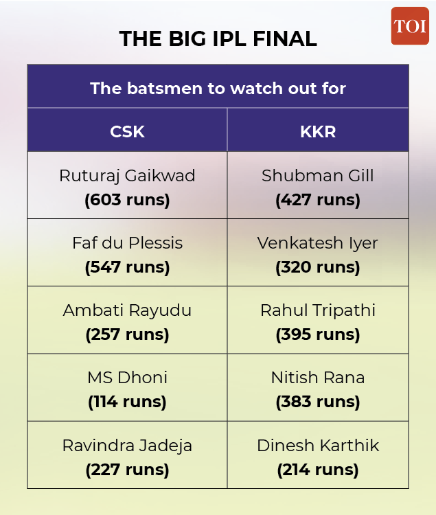 On Friday, CSK's chances of winning a fourth title will depend on how well they handle the 12 overs from KKR's spin trio of Varun Chakravarthy (economy rate 6.40), Shakib Al Hasan (ER:6.64) and Sunil Narine (ER:6.44), who have been outstanding in this tournament.