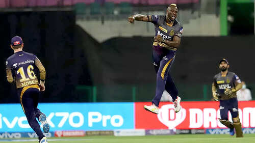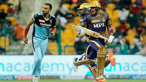 <p>The big win gave KKR's net run-rate a massive boost at No. 5, while the RCB are in third position on the points table (Photo: PTI/BCCI/IPL)</p>The Tamil Nadu player had a 'hand' in Kyle Jamieson's wicket too after a straight drive by Harshal Patel dislodged the stumps at the non-striker's end, touching Chakravarthy's fingers as Jamieson, backing up a long way, could not return in time.