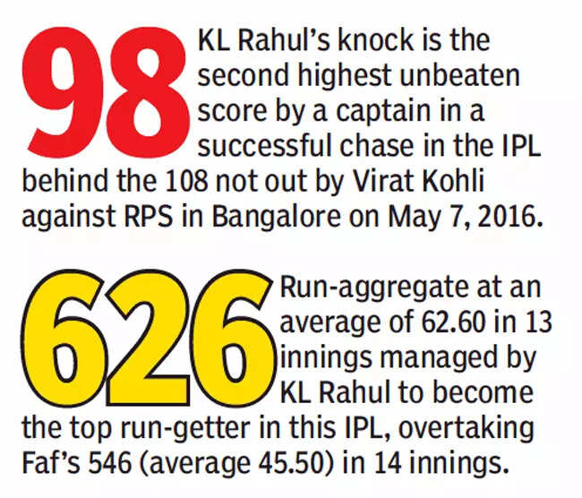 The beauty of Rahul's effort was that there was no brutality about it. He just decided to take the game away from CSK in the Powerplay overs with some easy, elegant hitting over the top. While anything pitched up went over the bowler's head, Rahul was equally proficient on the back-foot against the short balls. And even against Dwayne Bravo's slower yorkers, the right-hander found ways of scoring, making fantastic use of his wrists and playing it over fine leg. "The numbers guys told me that winning the game within 14 overs gives us the best chance to qualify and I just tried to do that," Rahul said at the end of the match.