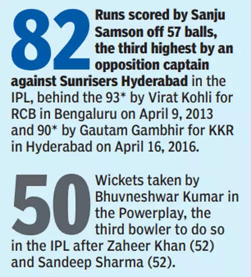 Having seen the damage Harshal Patel wreaked on Sunday with slower deliveries, the Sunrisers’ bowlers utilised them well. But RR captain Samson was in a different zone as the last two overs of Rashid Khan fetched 20 runs.