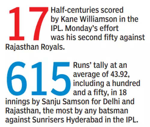 Williamson applied the finishing touches with an unbeaten 51 (41b, 4x5, 6x1) in the company of young Abhishek Sharma (21*, 16b, 4x1, 6x1) and the duo’s unbroken 53-run stand for the fourth wicket that took Sunrisers to 167/3 upstaged skipper Sanju Samson’s 82 (57b, 4x7, 6x3), which helped Royals post 164/5.