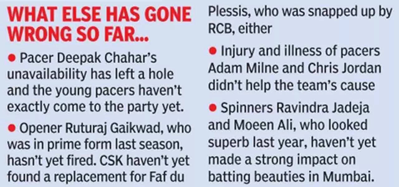 The rocky start to the CSK campaign hasn't only been about the captaincy transition. CSK's well-documented strategy of banking on old hands hasn't given the returns thus far. It is looking even more glaring because some of the other Indian newcomers like Ayush Badoni (Lucknow), Lalit Yadav (Delhi Capitals) and Vaibhav Arora (Punjab Kings) are making a significant impact.