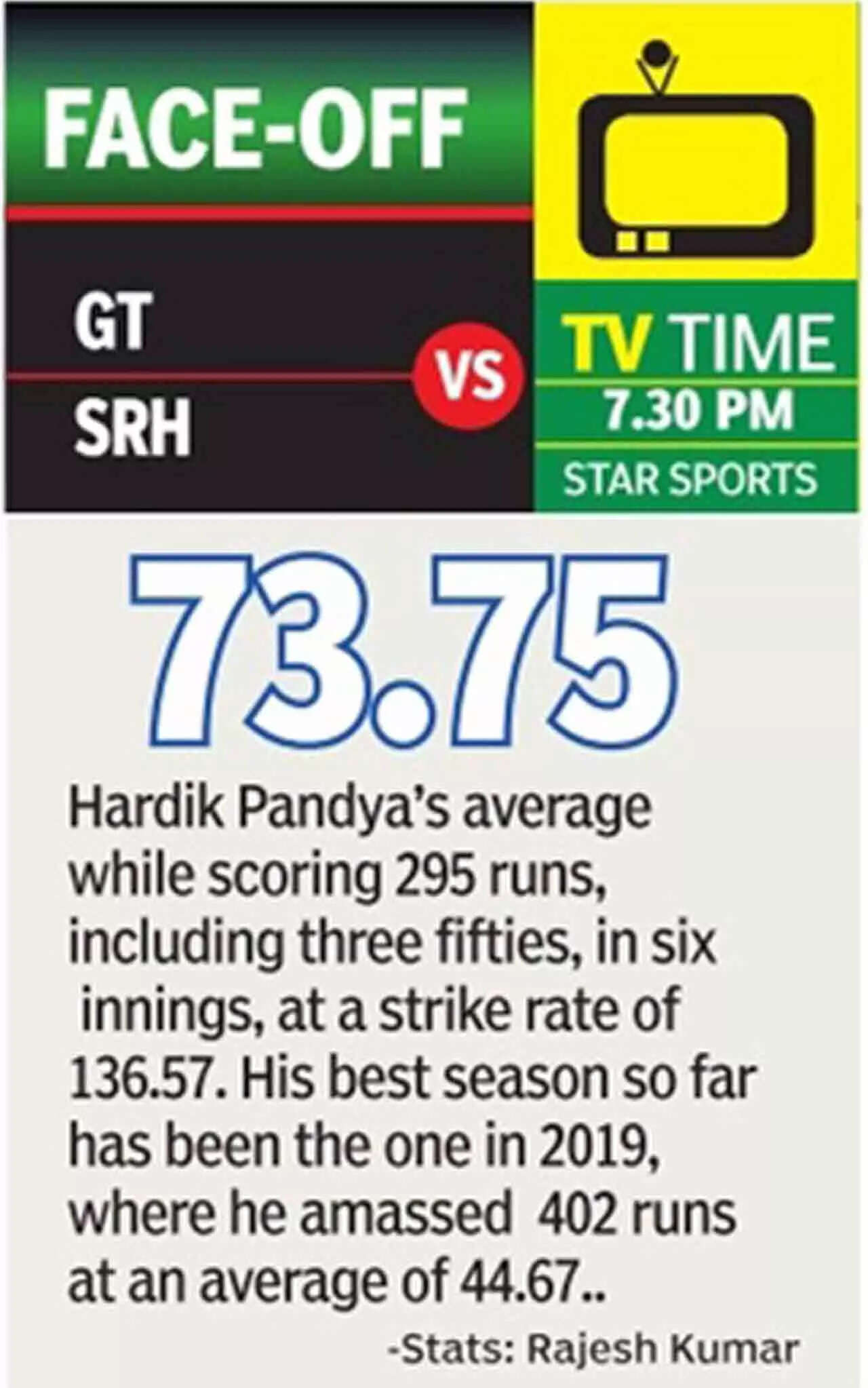 The eight-wicket defeat to Sunrisers is the Titans' only blemish in a run that has seen them log six wins in seven outings. Rashid Khan has revelled in the role of a captain but with Hardik Pandya back and among runs in the eight-run win over Kolkata Knight Riders, the Afghan leggie will have a greater role to play against a team he was part of till last season.