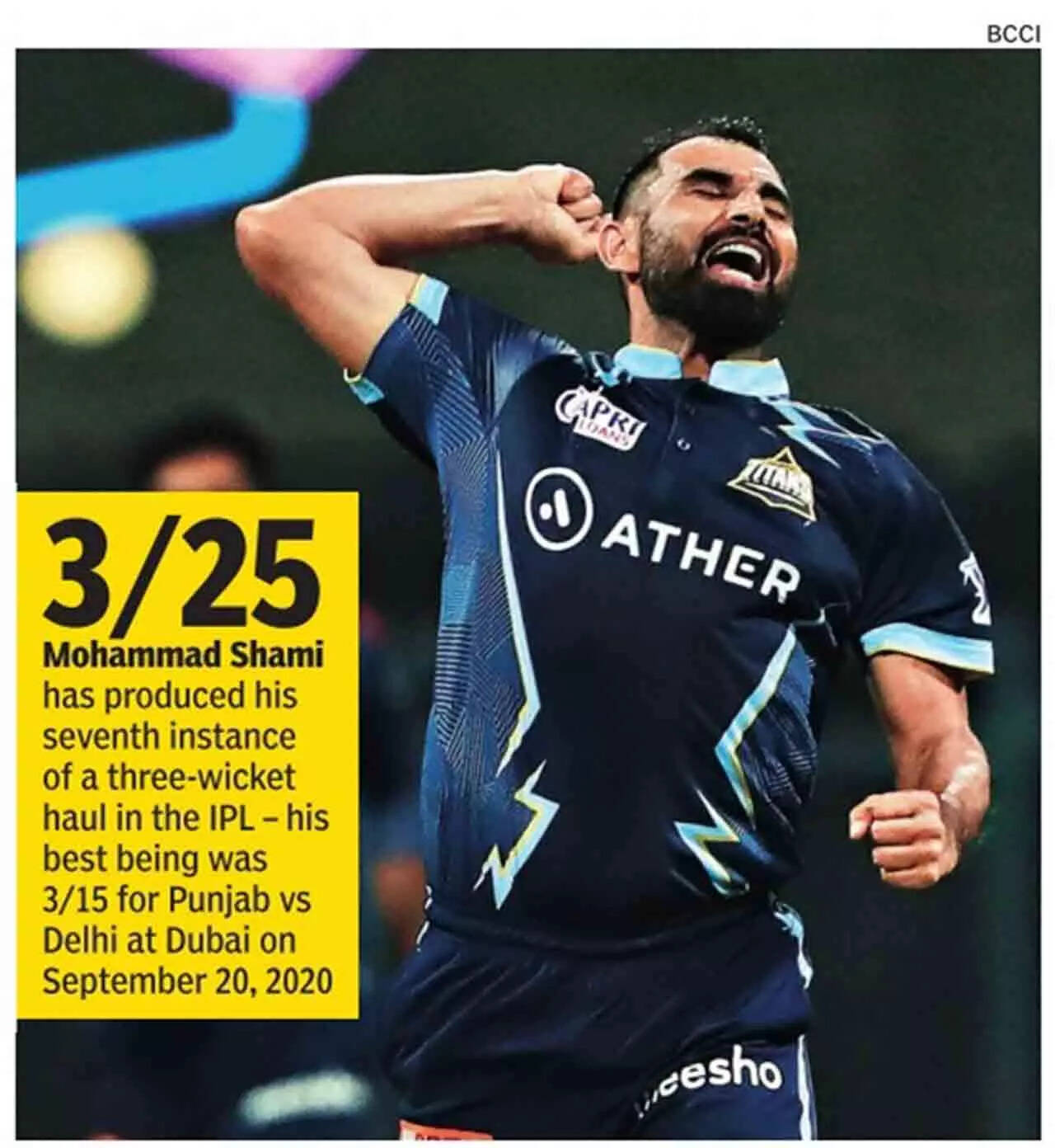 <p>Shami set up the win for Gujarat after he returned figures of 3/25 to restrict Lucknow, led by KL Rahul, to 158/6. (BCCI/IPL Photo)</p>4/10:Shami rattles LSG