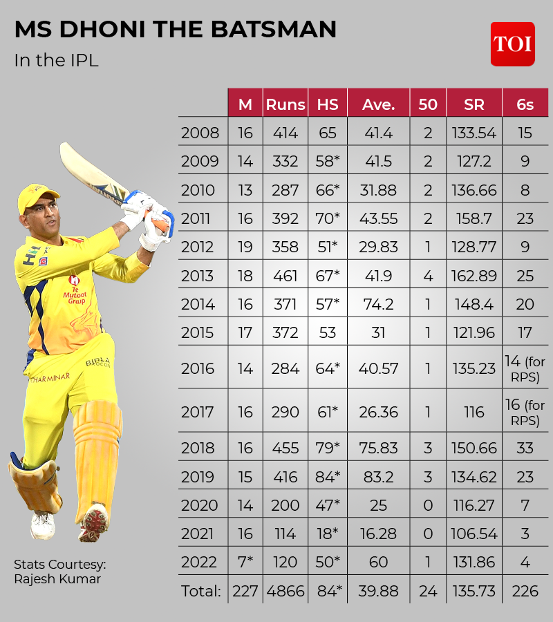 Overall in the IPL, in which Dhoni has played for two teams - CSK and Rising Pune Supergiant - he has scored a total of 4866 runs in 227 matches, with a highest score of 84* and an average of almost 40. He has an overall IPL strike rate of 135.73 and has smashed as many as 226 sixes.