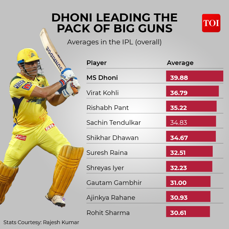 Dhoni not only has one of the best strike rates in the IPL but also has an overall IPL average that is better than most Indian top guns. The fact that he largely remains not out after his match-winning knocks of course adds to the average. The graphic below shows how Dhoni's average of 39.88 is better than those of the likes of Sachin Tendulkar, Virat Kohli, Rohit Sharma, Shikhar Dhawan, Rishabh Pant and others.