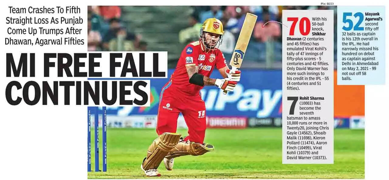Earlier, coming out all guns blazing, Punjab Kings, displaying an entertaining, attacking brand of cricket which has become their trademark in IPL2022, thrashed a yet again clueless MI bowling to all corners of the ground while racing away to 198 for five after being asked to bat first.