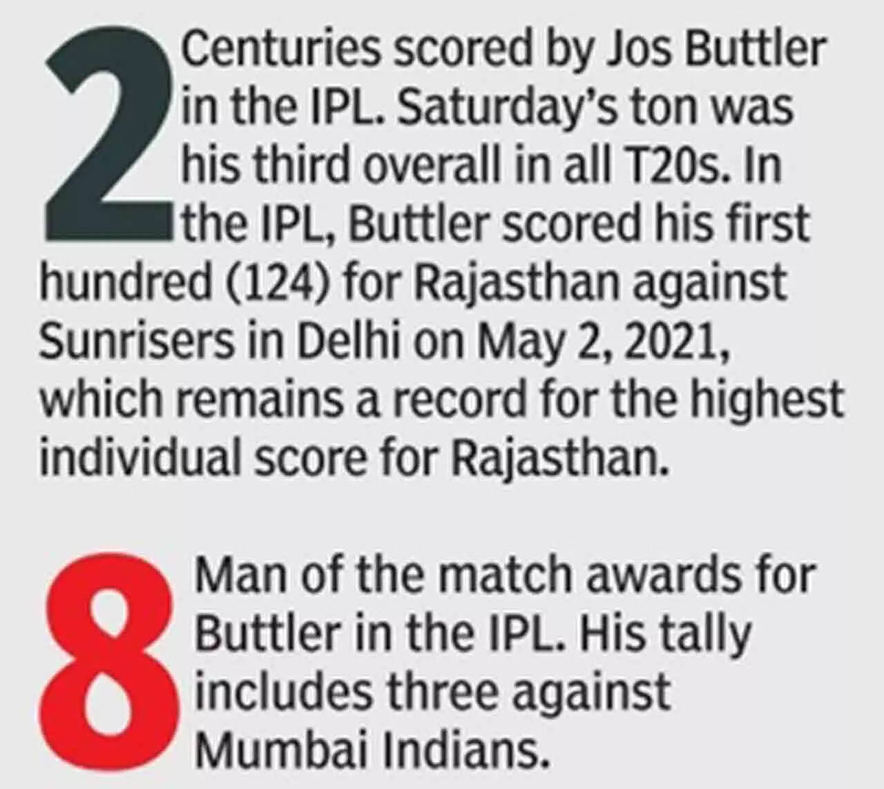 Looking determined to prove a point after the English selectors dropped him for the Test series in the West Indies recently, Jos Buttler smashed a typically breathtaking 100 (68b; 114, 5x6), the first century of this IPL season, besides taking two catches to power Rajasthan Royals to a 23-run victory over Mumbai Indians. The catch to send back Daniel Sams, in which Buttler ran from cover to mid-off before diving, was a screamer.