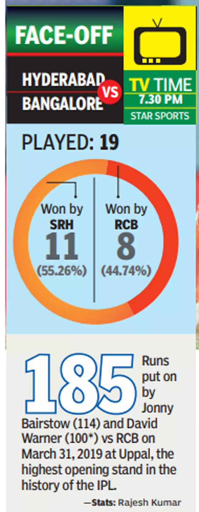 RCB have had one of their best starts, winning five of their seven matches. SRH, after a slow start, have found form with four consecutive wins.