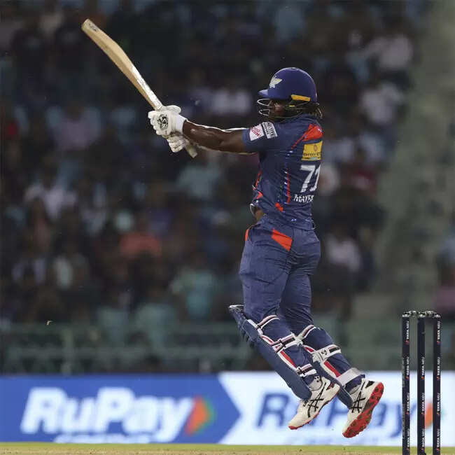 For LSG: KL Rahul - 8 (12); Kyle Mayers - 73 (38) - with 2 fours and 7 sixes