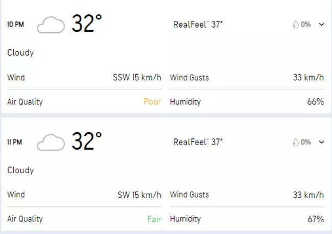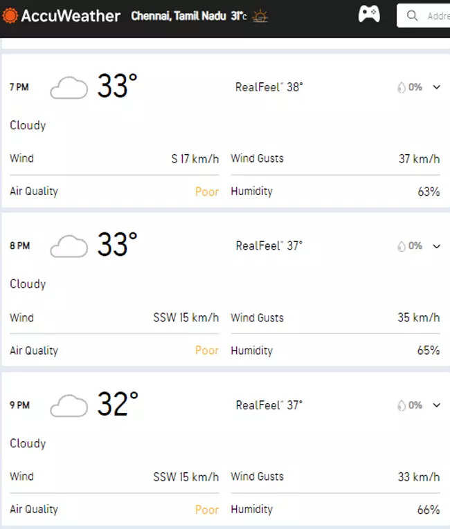 Sunday is expected to remain cloudy in Chennai with evening humidity exceeding 60% but 0% chance of rain as per AccuWeather's forecast.