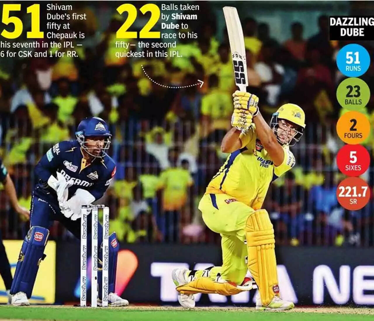 <p>In his debut IPL season, Rachin scored 46 runs off 20 balls, while captain Ruturaj also contributed 46 runs as Chennai posted 206-6 at their home ground, M.A. Chidambaram Stadium.<br /></p>PTI4/10:Shivam Dube