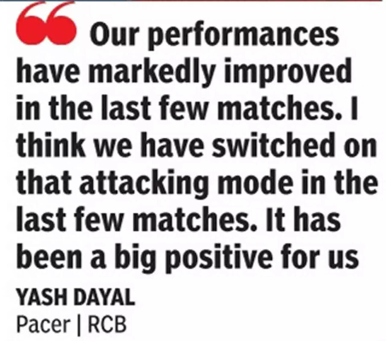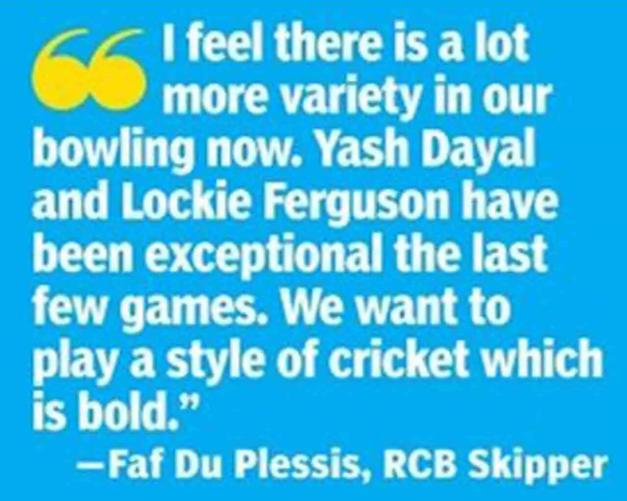 Elaborating further, skipper Du Plessis said, "The first of the season, things didn't quite come together. Now, from a batting and bowling perspective we have been able to put it together. A lot of work has gone behind the scenes, and we are getting it right and I feel there is a lot more variety in our bowling now. Yash (Dayal) and Lockie (Ferguson) have been exceptional the last few games. We want to play a style of cricket which is bold and put some performances together and keep going."