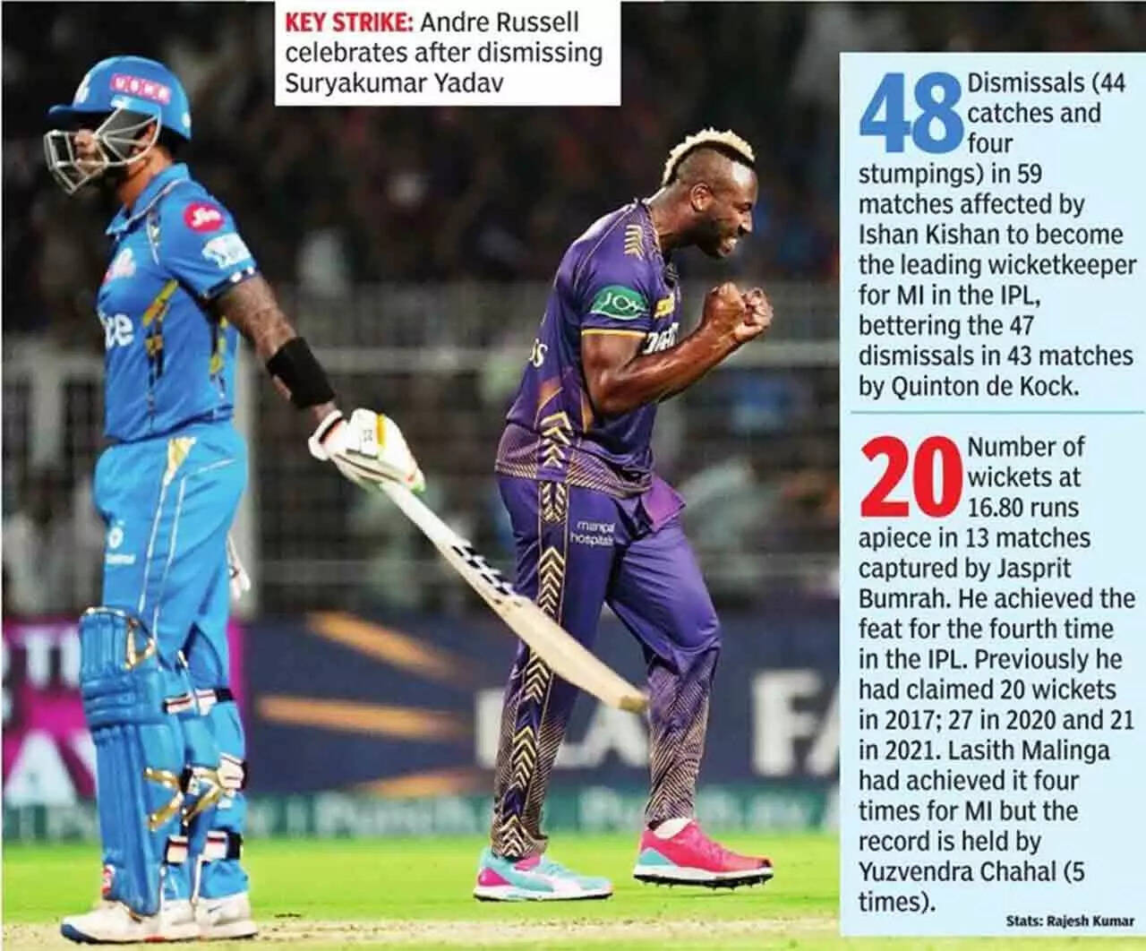 The purple brigade suffered a double setback losing both their in-form openers in the first two overs. Philip Salt opened with a six off pacer Nuwan Thushara but the Englishman perished to a slower one being caught at fine leg by Anshul Kamboj in the last ball of the first over. Jasprit Bumrah then dislodged Sunil Narine's off-stump with the left-hander offering no stroke.