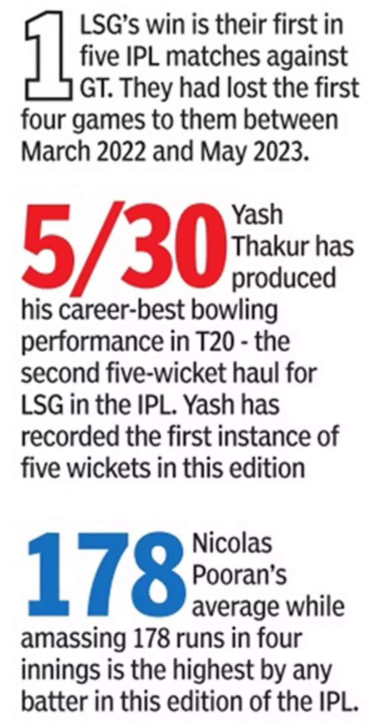 In this match, the focus shifted on Yash Thakur who bagged five wickets for 30 and was deservedly named man of the match. This was LSG's first win over GT in five matches over three seasons.