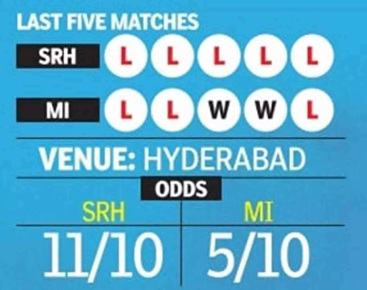 HYDERABAD: Having begun their campaign in the new IPL season on a similar note - losing by narrow margins - Sunrisers Hyderabad and Mumbai Indians eye their first victory when they clash at the Rajiv Gandhi International Stadium on Wednesday.