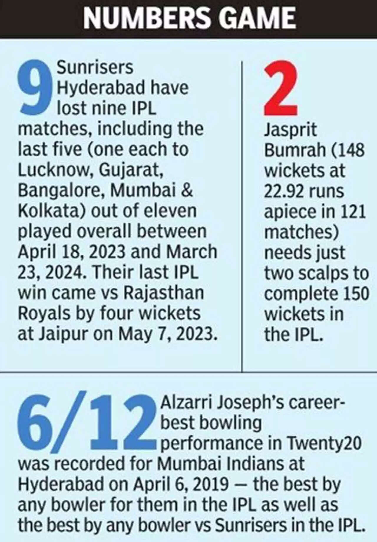 As far as batting is concerned, Rohit was at his attacking best against Gujarat, but Ishan Kishan will be under pressure after a poor return. The absence of Suryakumar Yadav puts more pressure on the likes of Tilak Varma, Brevis and Tim David, all capable of handling any situation. In the bowling department, with Bumrah as their spearhead, Mumbai, who enjoy a 12-9 win-loss record against SRH, have good variety in Gerald Coetzee, Luke Wood and Piyush Chawla.