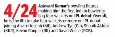 If it was left-arm spinner Vignesh Puthur who made an impressive debut in the opening match against Chennai Super Kings, taking three for 32 in four overs, it was Ashwini’s turn to zoom into the limelight at the Wankhede.