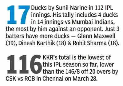 After asking KKR to take first strike, MI shot out the defending IPL champs for 116 in just 16.2 overs. Ashwini , of course, capitalized on early strikes by MI’s senior pacers Deepak Chahar ( two for 19 in two) and Trent Boult (1-23 in four overs), while the hosts also thrived on some electric fielding by Naman Dhir, who took three catches, the last one, a diving effort to pouch Harshit Rana (4) off Puthur, being a gem.