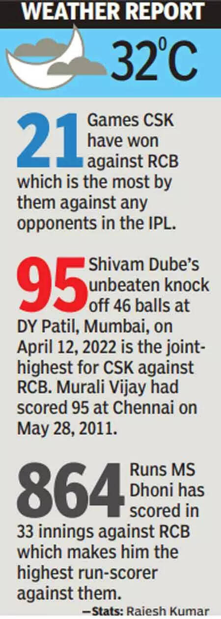 CHENNAI: This match is more than just another day in the office. Chennai Super Kings vs Royal Challengers Bengaluru isn’t quite the El Clasico of IPL because the head-to-head is a bit lop-sided in CSK’s favour. But there’s an element of rivalry that creates a sense of a derby.