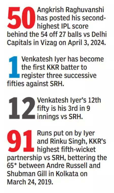 Although KKR got off to yet another poor start after Sunrisers Hyderabad (SRH) skipper Pat Cummins put them in to bat, some incredible hitting by Venkatesh Iyer (60 off 29 balls; 7x4, 3x6) and Rinku Singh (32 not out off 17 balls; 4x4, 1x6) saw the hosts getting their first 200-run total this season.