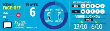 MI and LSG are sixth and seventh respectively on the points table, though Friday’s tie puts more pressure on Lucknow since it is another ‘home’ game, even though any sort of help from the surface hasn’t been forthcoming yet, leading to controversy.