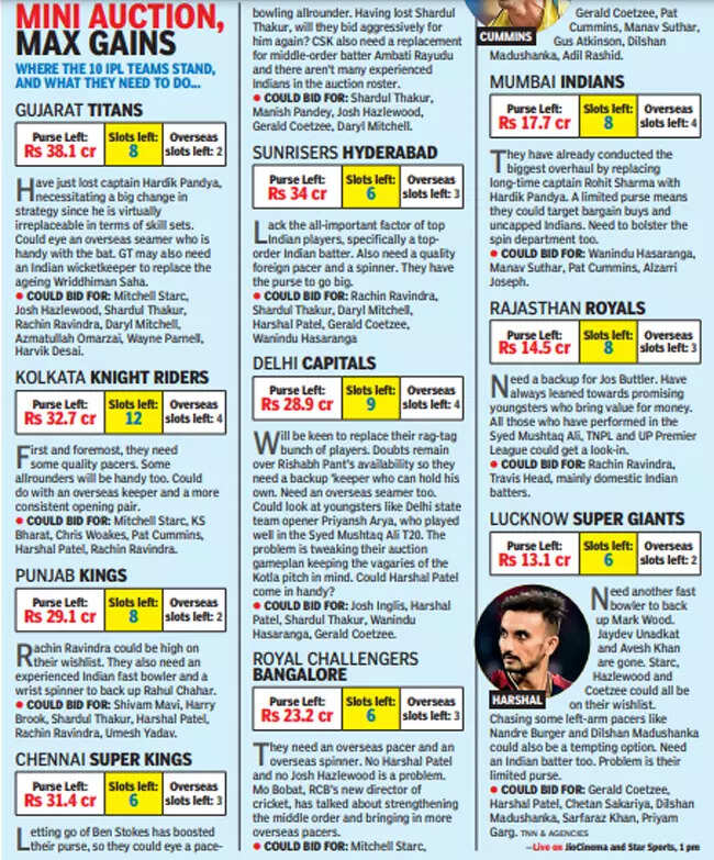 It will be interesting to see how the Gujarat Titans, having just traded their previous captain, India allrounder Hardik Pandya to the Mumbai Indians in an all-cash deal, go about finding an allrounder who can provide the balance to their side. Having an additional Rs 15 crore in their purse post the trade-overall (Rs 38.15 crore), GT will have a deep pocket to spend from.
