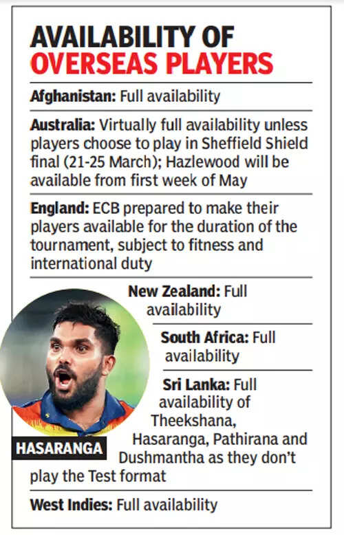 Also expect leg-spinning allrounder Wanindu Hasaranga (base price Rs 1.5 crores) — Sri Lanka’s go-to bowler in whiteball formats — to rake in a good sum at the auction. The allrounder was rather surprisingly released by the RCB, who had bought him in 2022. The 26-year-old has claimed 216 wickets in 157 T20s, with an average of 16.99, and an economy rate of 6.81.