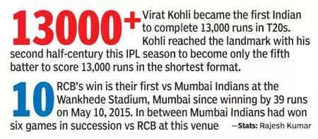 MUMBAI: In a game that swung like a pendulum, Royal Challengers Bengaluru (RCB) held on to record a narrow 12- run win over Mumbai Indians (MI) in the Indian Premier League on Monday at the Wankhede Stadium.