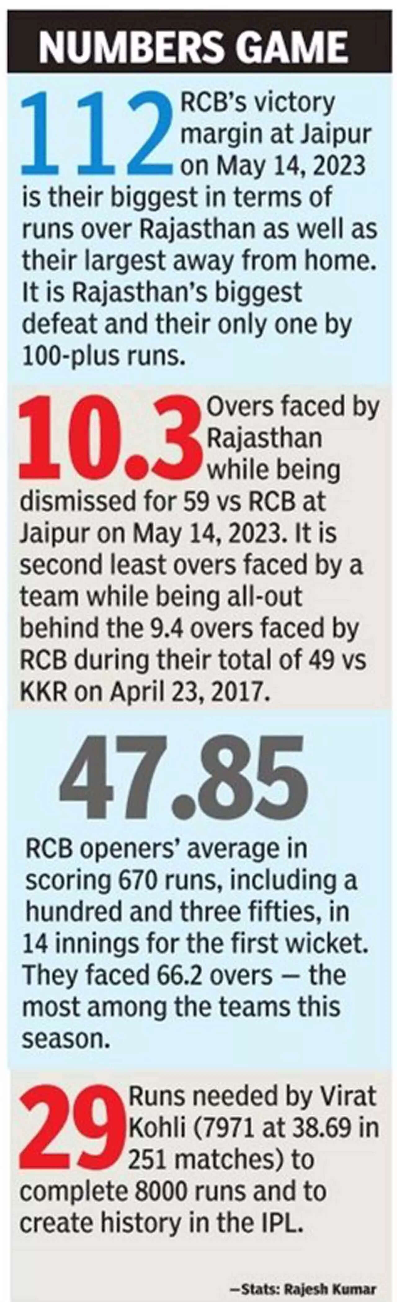 RR won eight of their first nine matches and looked good to top the table before a string of four defeats and a no-result saw them being leapfrogged by Kolkata Knight Riders (KKR) and Sunrisers Hyderabad. RCB took an altogether different route. After winning just one of their first eight matches, they won six on the bounce to clinch the fourth place and make the playoffs.