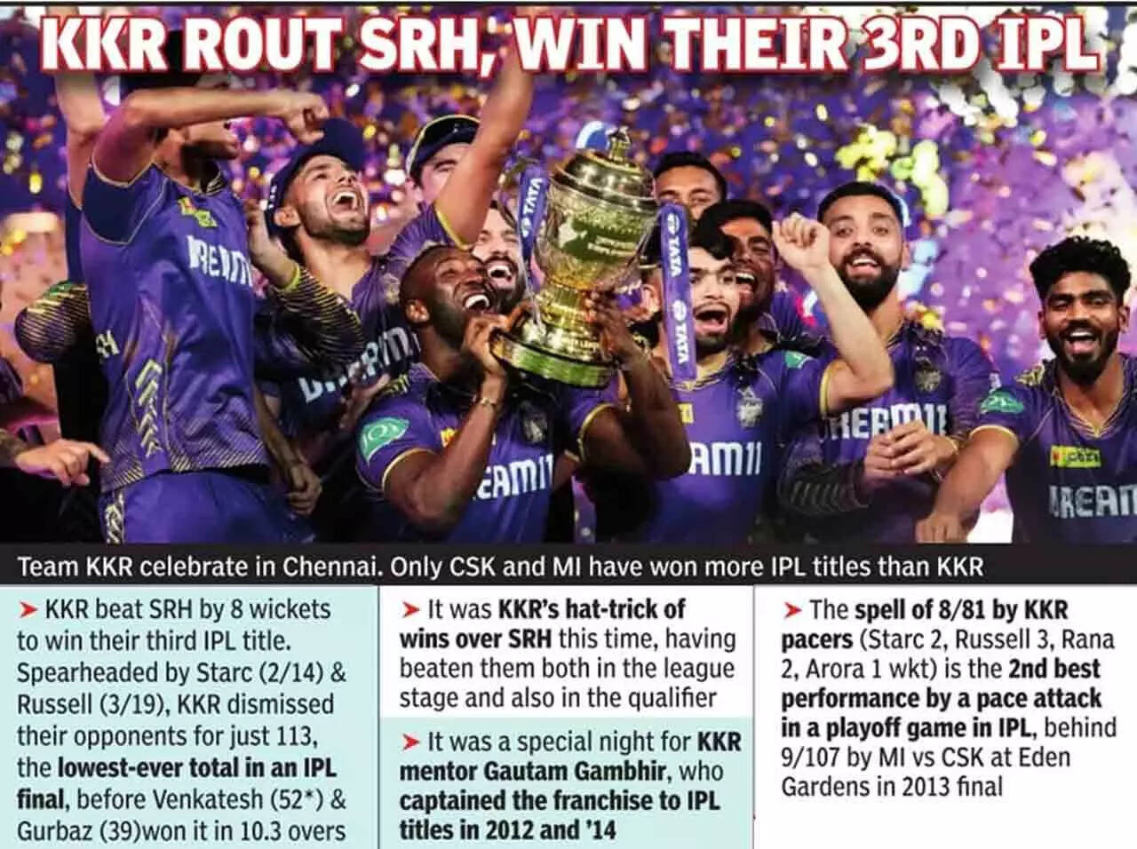 Gambhir's biggest punt of the season, Mitchell Starc for Rs 24 crore, proved to be worth every penny as the Aussie decimated Sunrisers Hyderabad for the lowest score of an IPL final. SRH were bowled out for 113 in the 19th over, 12 short of Chennai Super Kings' 125 at the 2013 Eden Gardens final against Mumbai Indians.