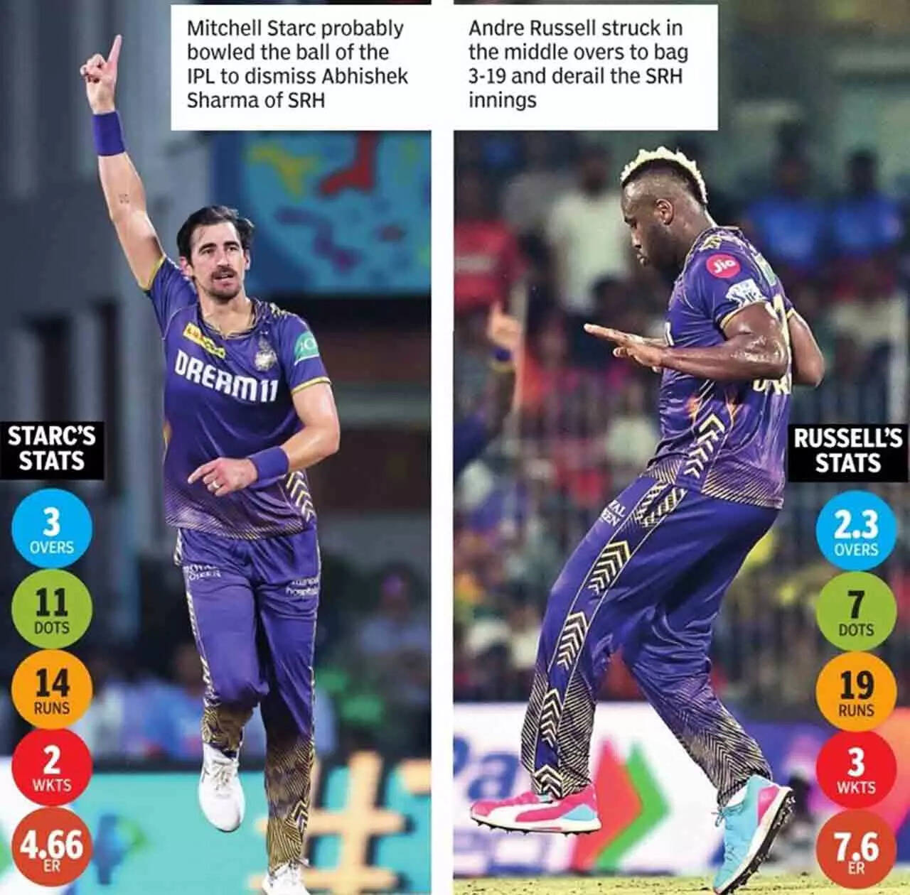 While Harshit used his subtle variations beautifully with the occasional slower balls - one accounting for Klaasen - Narine was his usual stingy self. If that was not enough, old pro Andre Russell (3-19) was equally brilliant.