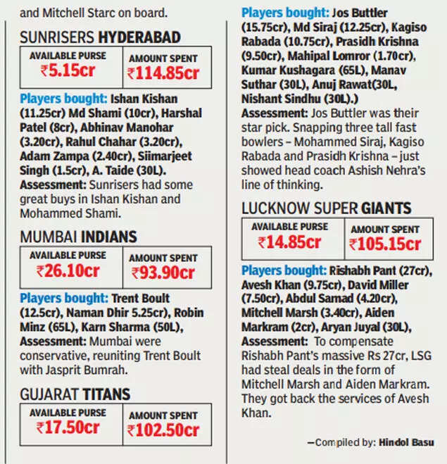 SRH also signed wicketkeeper-batter Ishan Kishan for Rs 11.25cr. Meanwhile, Kagiso Rabada joined Gujarat Titans for Rs 10.75cr.