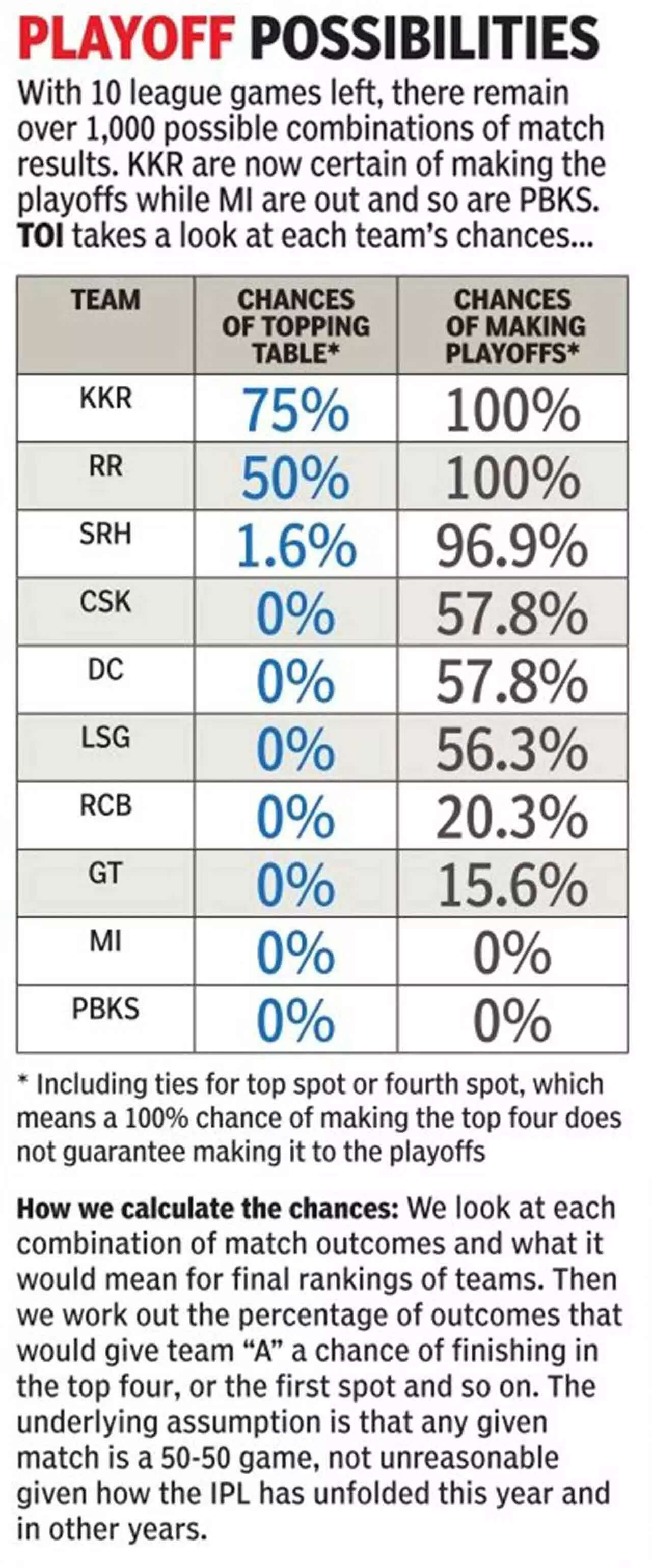 In short: KKR are through to the playoffs. Bet on RR too making it and SRH most likely to join them, leaving CSK, LSG and DC battling it out for the fourth spot. For RCB or GT to get into the mix would need many results to go their way.