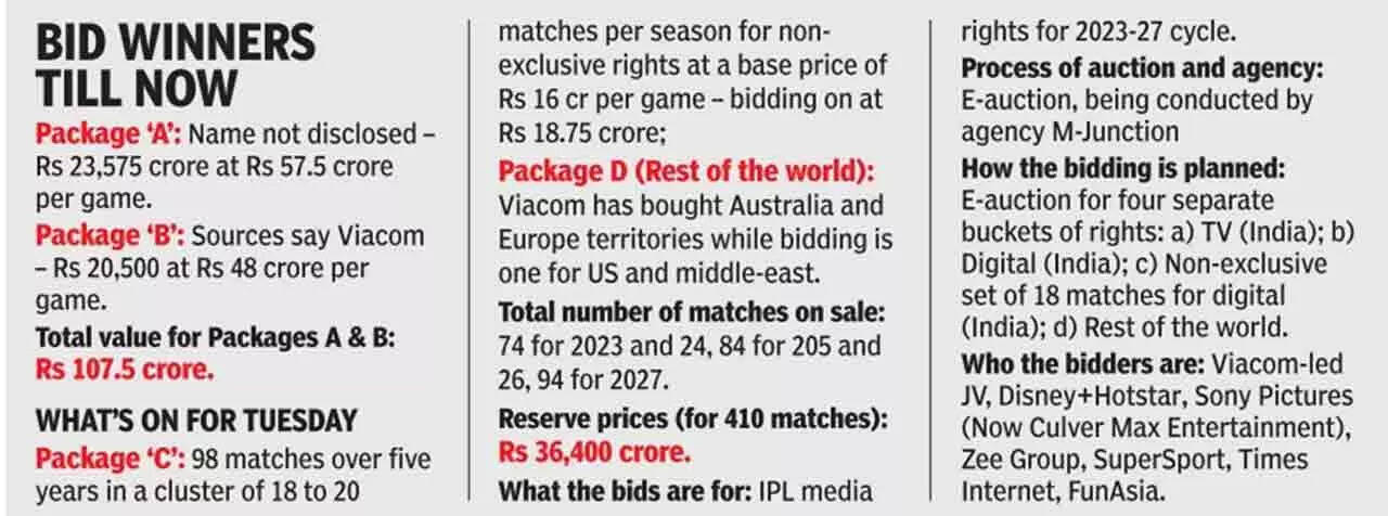 MUMBAI: At Rs 23,575 crore for television and at Rs 20,500 crore for digital, the BCCI sold Packages ‘A’ and ‘B’ of the Indian Premier League (IPL) to two separate bidders on Day Two of the e-auction on Monday.