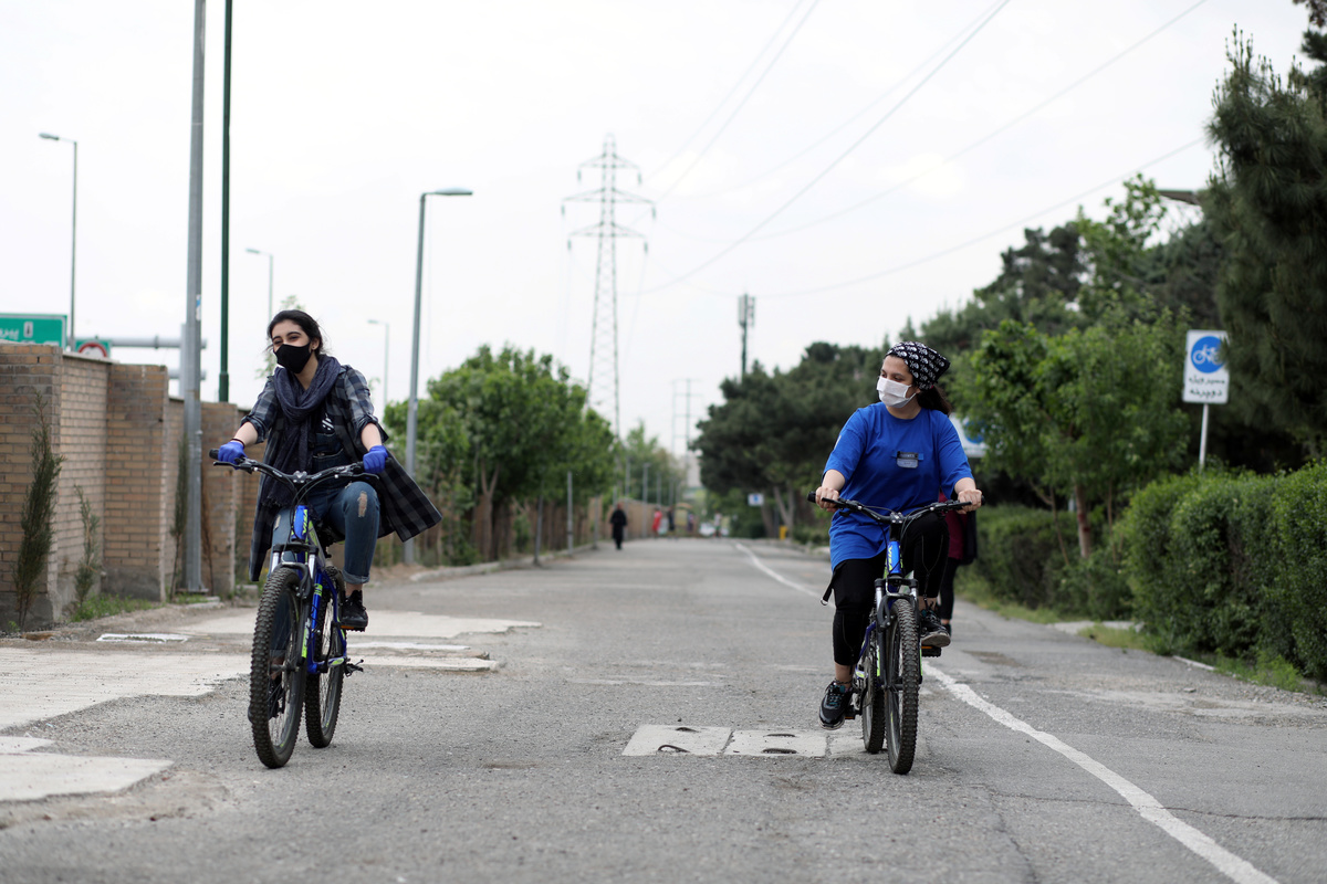 Girls wearing protective face masks and gloves ride their bicycles following the outbreak of the coronavirus disease (COVID-19), in Tehran, Iran, April 30, 2020. WANA (West Asia News Agency)/Ali Khara via REUTERS