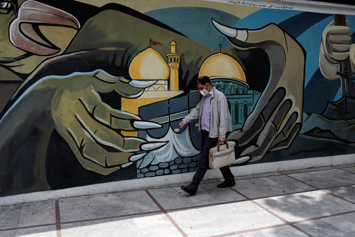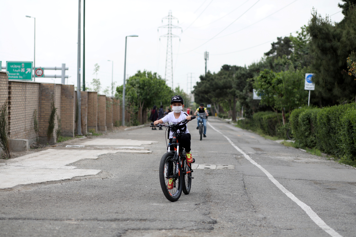 A boy wearing a protective face mask rides his bicycle following the outbreak of the coronavirus disease (COVID-19), at a park in Tehran, Iran, April 30, 2020. WANA (West Asia News Agency)/Ali Khara via REUTERSA man wearing a protective face mask walks past a Palestine mural on the wall following the outbreak of the coronavirus disease (COVID-19), in Tehran, Iran, April 30, 2020. WANA (West Asia News Agency)/Ali Khara via REUTERS