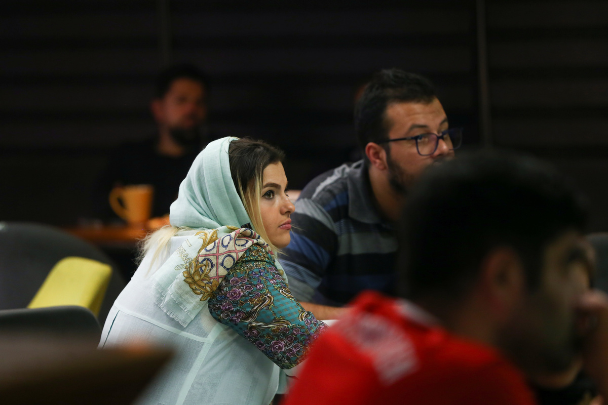 An Iranian woman watch a football match with her friend at a cafe in Tehran, Iran September 15, 2019. Picture taken September 15, 2019. Nazanin Tabatabaee/WANA (West Asia News Agency) via REUTERS ATTENTION EDITORS - THIS IMAGE HAS BEEN SUPPLIED BY A THIRD PARTY.