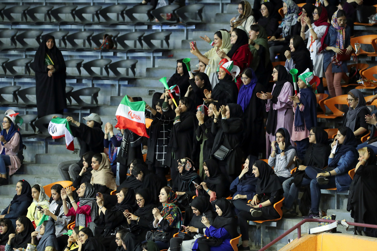 Iranian women attend Asian Men's Volleyball Championship between Iran and Qatar in Azadi stadium in Tehran, Iran September 14, 2019. Picture taken September 14, 2019. Nazanin Tabatabaee/WANA (West Asia News Agency) via REUTERS ATTENTION EDITORS - THIS IMAGE HAS BEEN SUPPLIED BY A THIRD PARTY.
