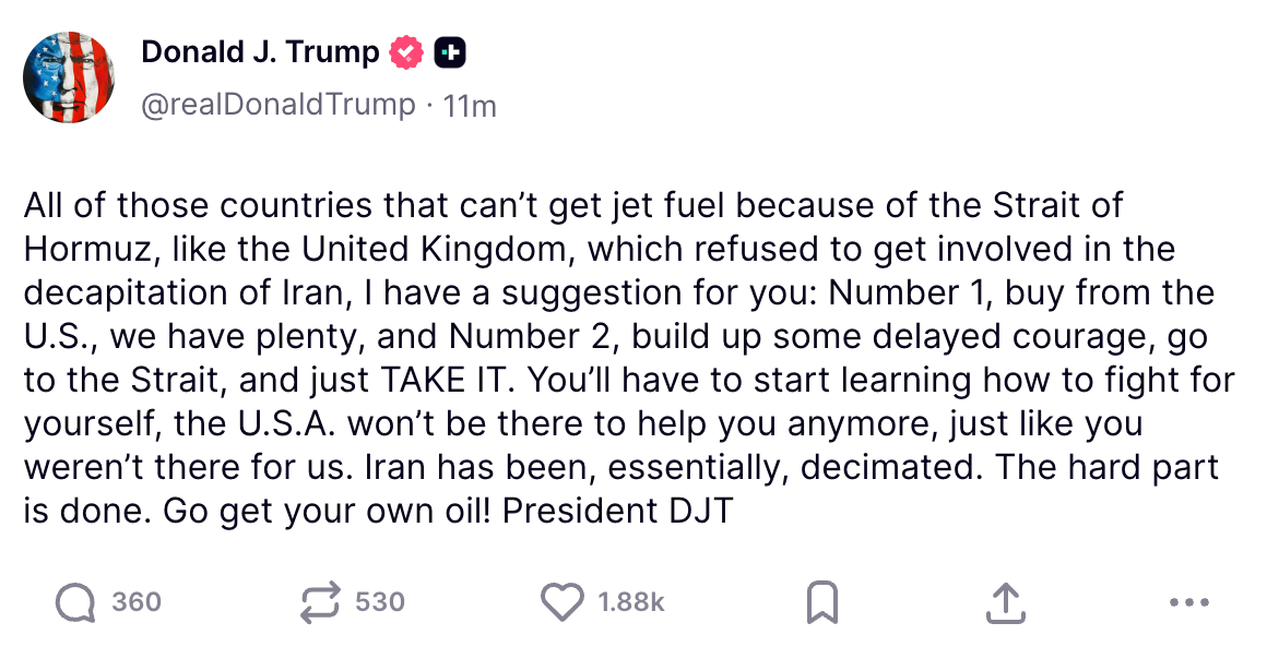 The US president wrote on Truth Social that countries like the UK, “which refused to get involved in the decapitation of Iran”, would have to learn to “fight for yourself” and “go get your own oil!”