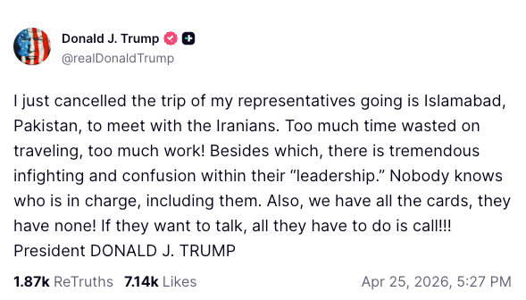 - Mr Trump cancelled a trip scheduled for US special envoy Steve Witkoff and Jared Kushner to visit Islamabad, Pakistan, after saying the distance was too far to travel and “too much work” without a plan.