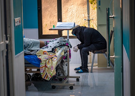Praying feverishly under her breath, the wife of a critically ill Covid-19 patient paces the corridors of the Baghdad coronavirus ward against a sudden tide of doctors. Behind her on the hospital bed, her asthmatic husband starts to spasm painfully as his airways close. Exhausted medics rush to save his life. Against the insistent sigh of ventilators, with her head bowed, his wife pleads for a miracle.