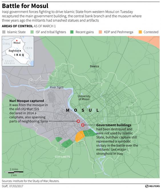 The government buildings had been destroyed and were not used by Isis, but their capture still represented a symbolic victory in the battle over the militants' last major stronghold in Iraq.