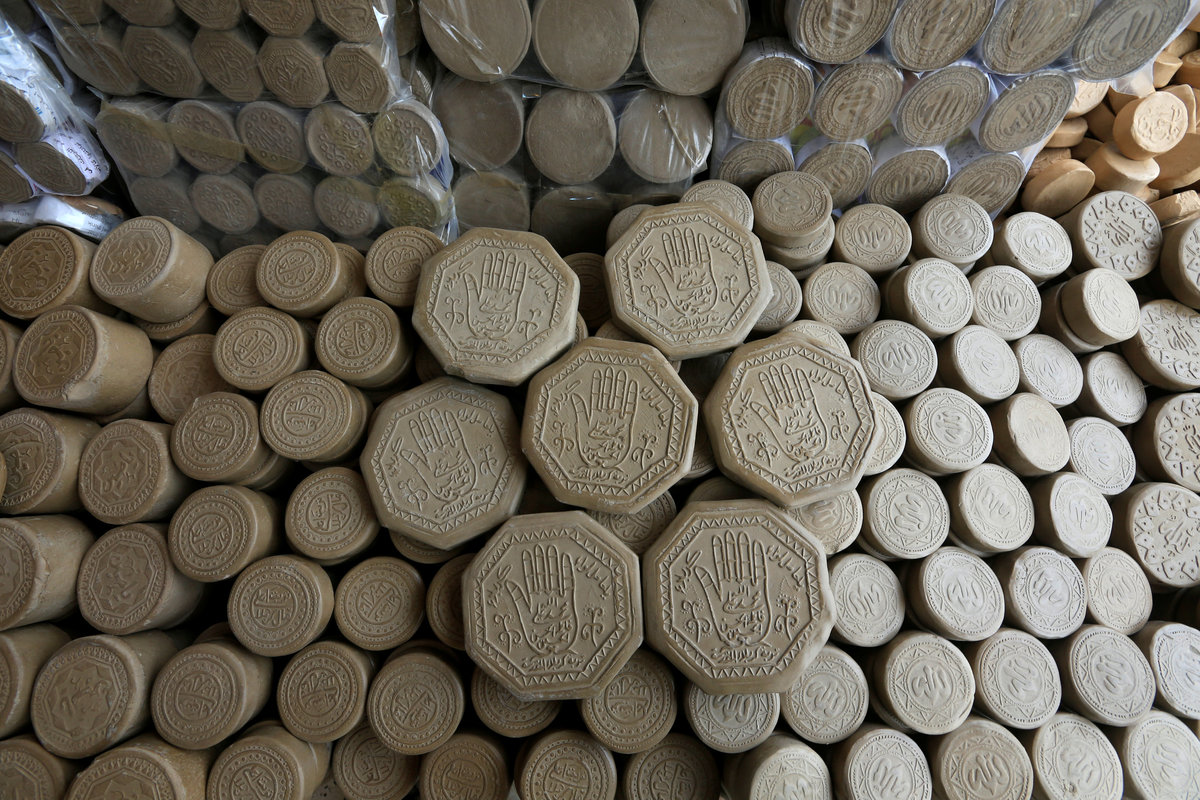 The tablets, known as "turbah" or soil in Arabic, come in many shapes - round, square, lozenge, half-circle - with various inscriptions, often praising Imam Hussein, Prophet Mohammad's grandson who is buried in the city.