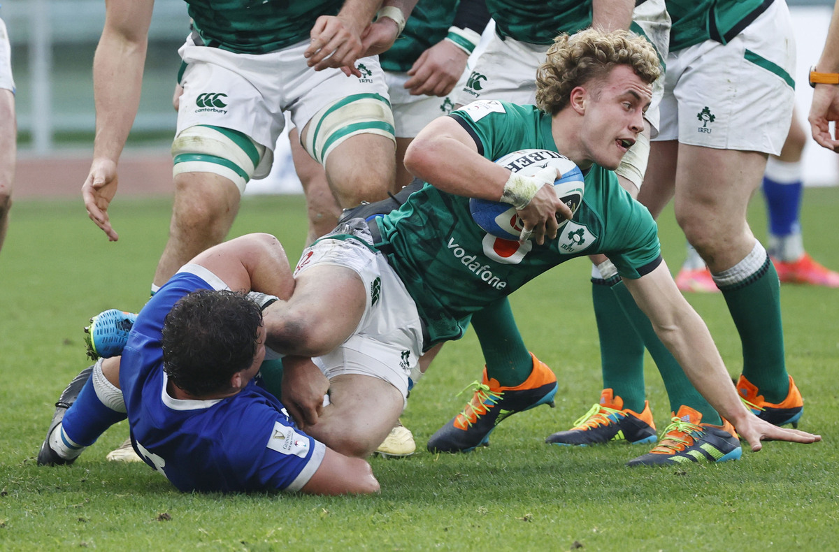 Another clever offload, this time from winger Jordan Larmour, sent Connors in at the corner for Ireland’s third, before Meyer revived Italian hopes with a try in the final seconds of the first half.