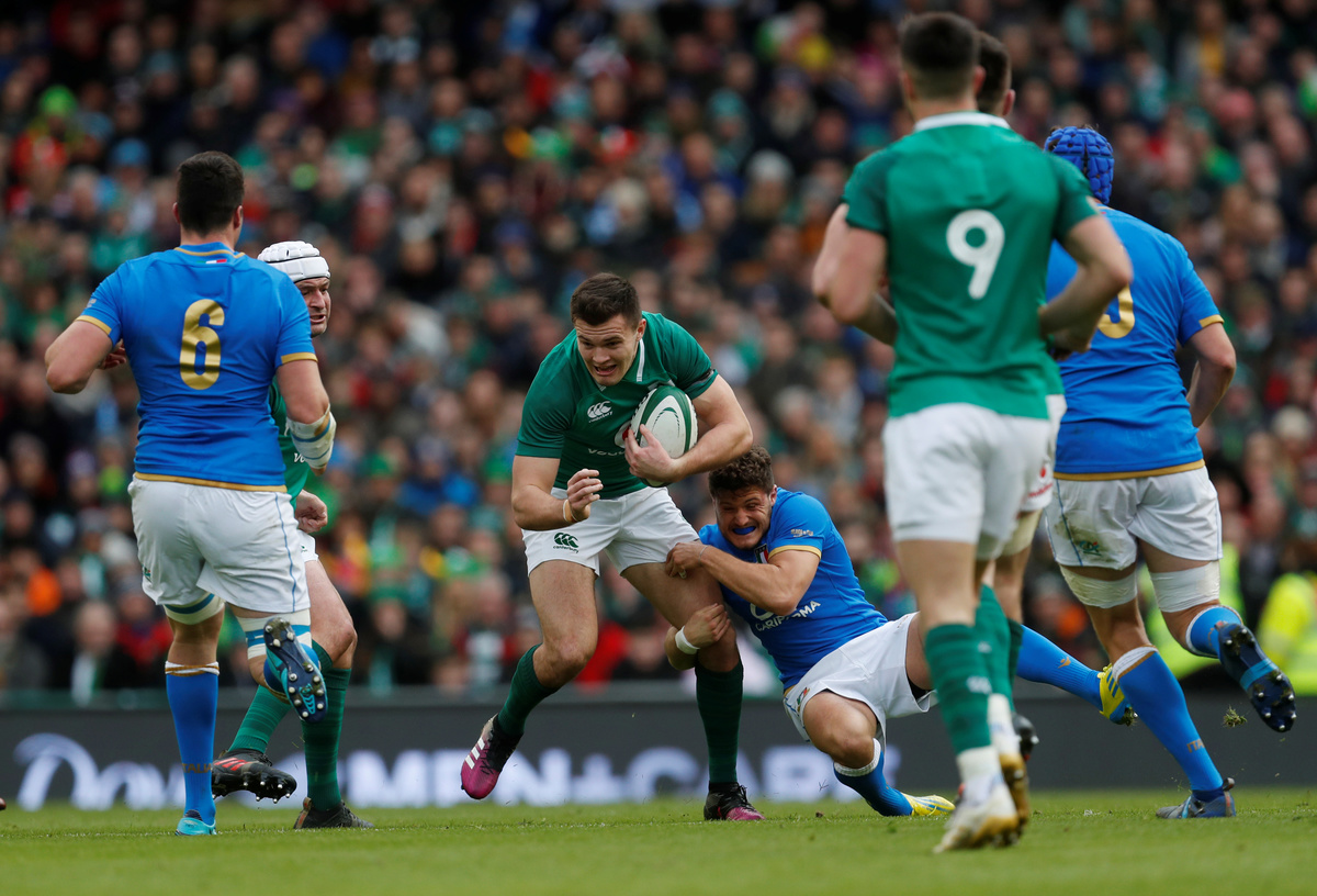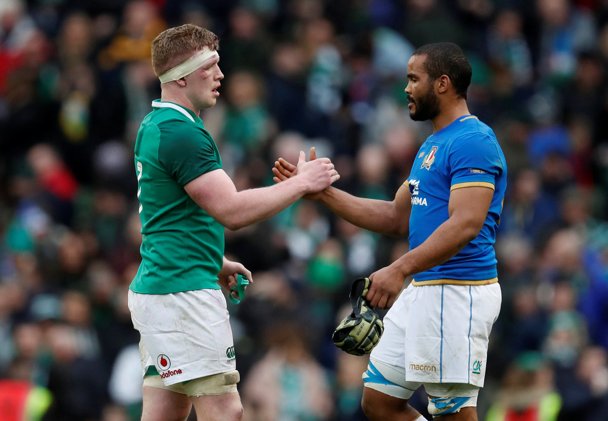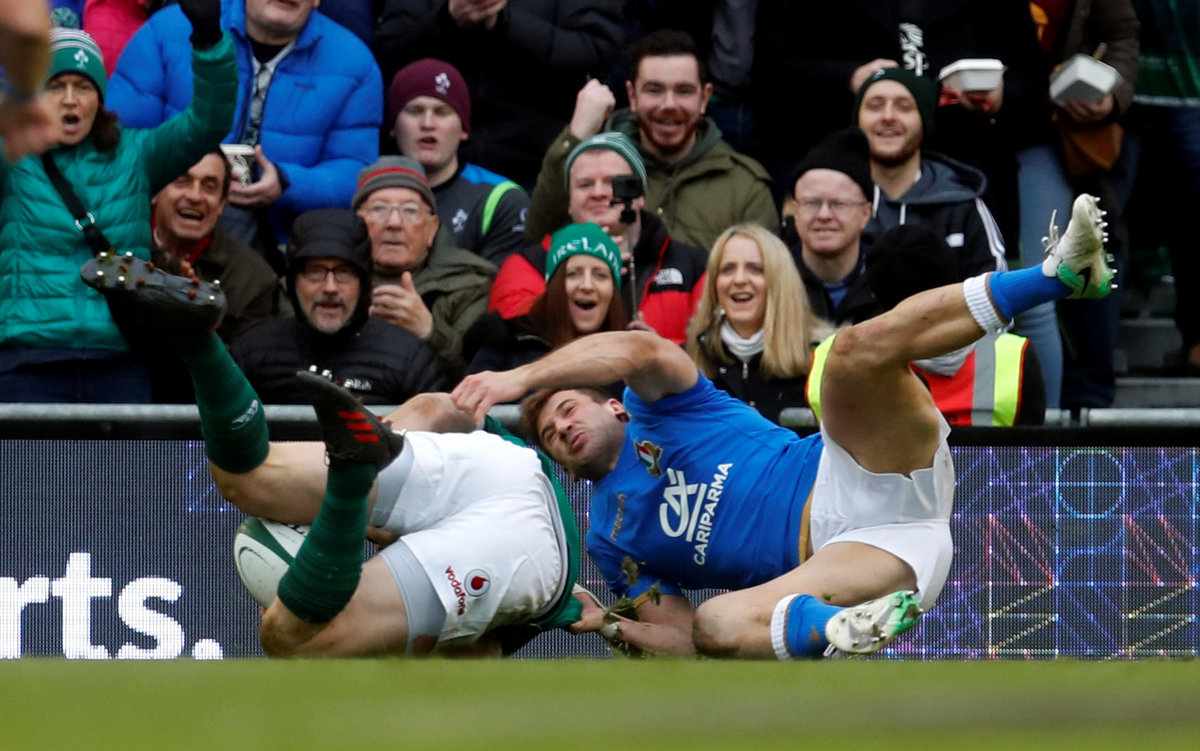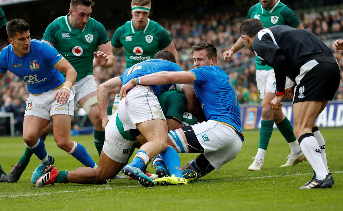 Rugby Union - Six Nations Championship - Ireland vs Italy - Aviva Stadium, Dublin, Republic of Ireland - February 10, 2018 Ireland’s Dan Leavy in action with Italy’s Braam Steyn REUTERS/Russell CheyneRugby Union - Six Nations Championship - Ireland vs Italy - Aviva Stadium, Dublin, Republic of Ireland - February 10, 2018 Ireland’s Conor Murray in action REUTERS/Russell CheyneRugby Union - Six Nations Championship - Ireland vs Italy - Aviva Stadium, Dublin, Republic of Ireland - February 10, 2018 Italy’s Mattia Bellini watches over a scrum REUTERS/Russell CheyneRugby Union - Six Nations Championship - Ireland vs Italy - Aviva Stadium, Dublin, Republic of Ireland - February 10, 2018 Ireland’s Bundee Aki scores their third try as Italy’s Tommaso Castello and Braam Steyn attempt to tackle REUTERS/Russell CheyneRugby Union - Six Nations Championship - Ireland vs Italy - Aviva Stadium, Dublin, Republic of Ireland - February 10, 2018 Ireland’s Robbie Henshaw scores their fifth try after an interception REUTERS/Russell CheyneRugby Union - Six Nations Championship - Ireland vs Italy - Aviva Stadium, Dublin, Republic of Ireland - February 10, 2018 Ireland’s Keith Earls celebrates scoring their fourth try with Rob Kearney REUTERS/Russell CheyneRugby Union - Six Nations Championship - Ireland vs Italy - Aviva Stadium, Dublin, Republic of Ireland - February 10, 2018 Italy players look dejected after conceding their fifth try REUTERS/Russell CheyneRugby Union - Six Nations Championship - Ireland vs Italy - Aviva Stadium, Dublin, Republic of Ireland - February 10, 2018 Ireland’s Robbie Henshaw walks off after sustaining an injury scoring the fifth try REUTERS/Russell CheyneRugby Union - Six Nations Championship - Ireland vs Italy - Aviva Stadium, Dublin, Republic of Ireland - February 10, 2018 Ireland’s Jacob Stockdale scores their seventh try REUTERS/Russell CheyneRugby Union - Six Nations Championship - Ireland vs Italy - Aviva Stadium, Dublin, Republic of Ireland - February 10, 2018 Italy’s Sergio Parisse in action with Ireland’s Joey Carbery REUTERS/Russell CheyneRugby Union - Six Nations Championship - Ireland vs Italy - Aviva Stadium, Dublin, Republic of Ireland - February 10, 2018 General view of a scrum in action REUTERS/Russell CheyneRugby Union - Six Nations Championship - Ireland vs Italy - Aviva Stadium, Dublin, Republic of Ireland - February 10, 2018 Italy’s Edoardo Gori scores their second try REUTERS/Russell CheyneRugby Union - Six Nations Championship - Ireland vs Italy - Aviva Stadium, Dublin, Republic of Ireland - February 10, 2018 Ireland’s Dan Leavy shakes hands with Italy’s Maxime Mbanda at the end of the match REUTERS/Russell Cheyne
