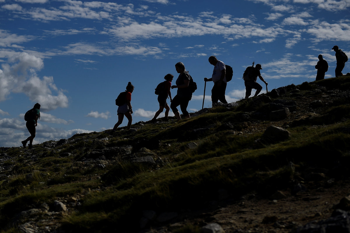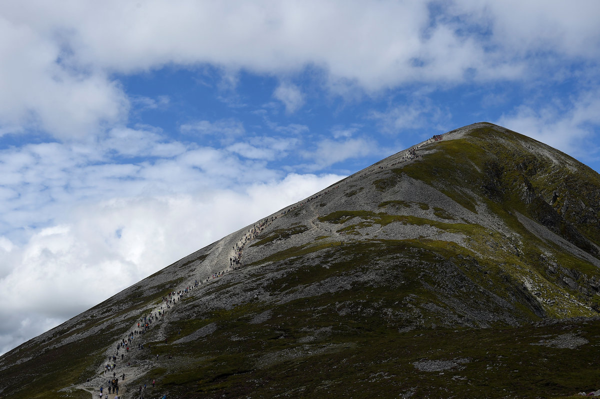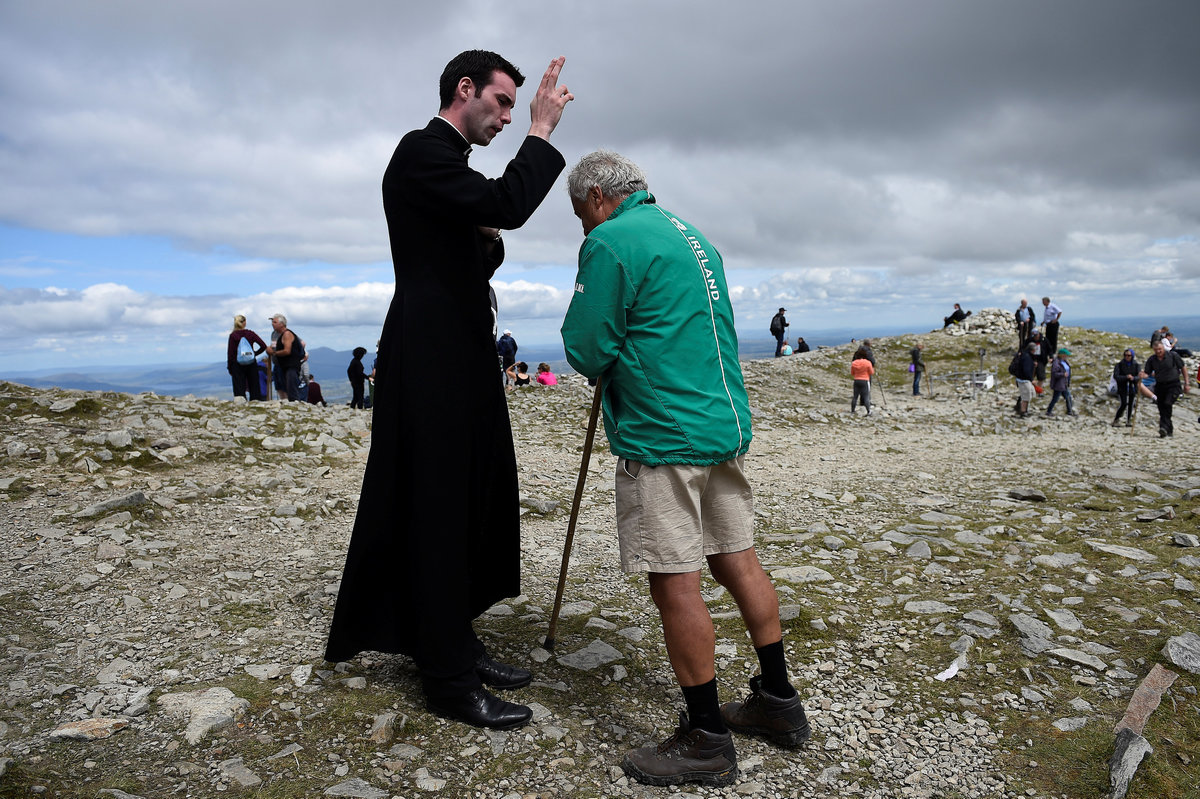 A pilgrim is blessed by the newly ordained Father Gerard Quirke after Mass at the summit of Croagh Patrick holy mountain during an annual Catholic pilgrimage near Lecanvey, Ireland, July 29, 2018. REUTERS/Clodagh Kilcoyne