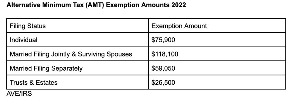 Here’s what the alternative minimum tax (AMT) exemption amounts look like for 2022, adjusted for inflation: